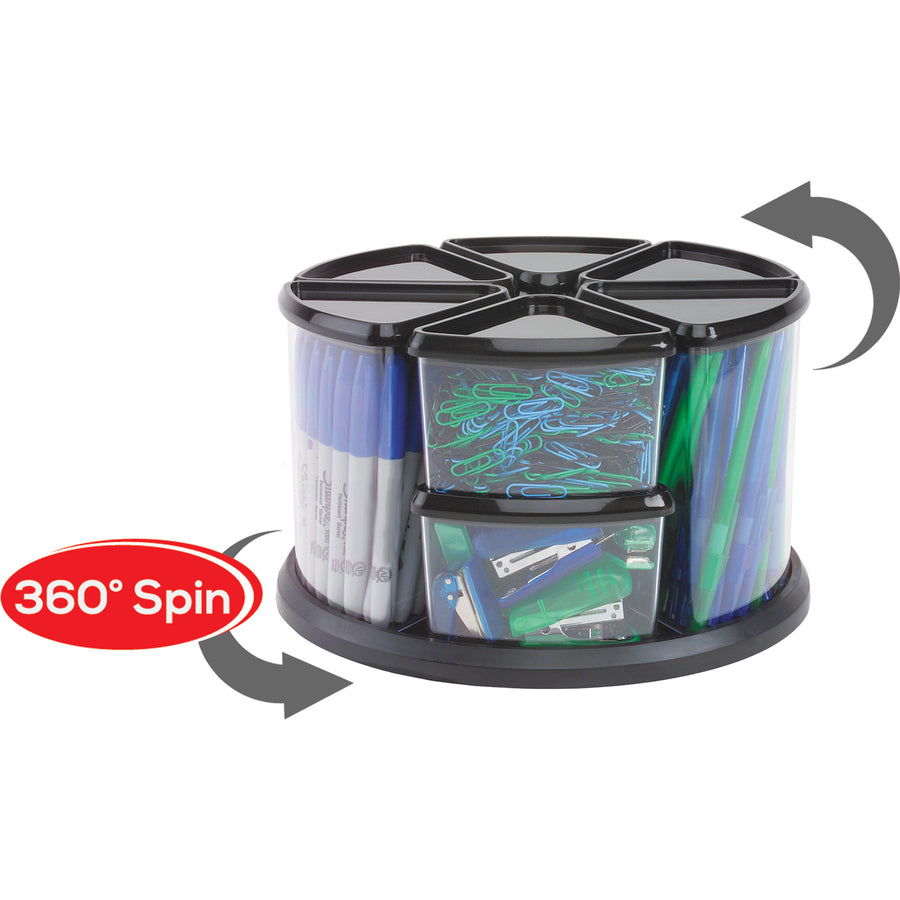 Get organized and stay organized with this rotating storage organizer that includes three 6" and six 3" canisters. Clear canisters feature black snap-on lids and revolving bases. Use to store craft and scrapbooking supplies or office and school items.