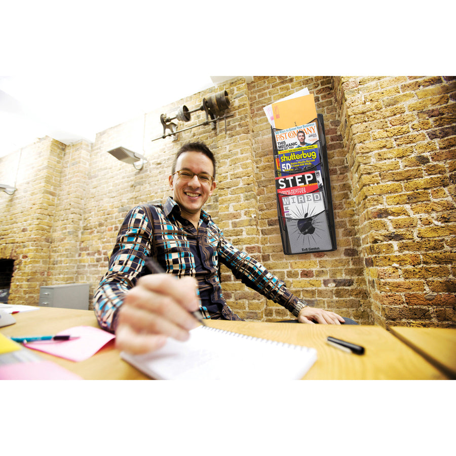 Mesh literature rack leaves the room free of magazine mayhem and full of modern materials with 5 spacious pockets. Perfect for use in a front office, reception area or a work area for keeping industry news close at hand. Each pocket measures 9" wide x 7-1/4" high and holds up to 5 lb. The opening is 3/4". Recycable magazine rack is made of steel with a powder-coat finish and includes wall-mounting hardware.