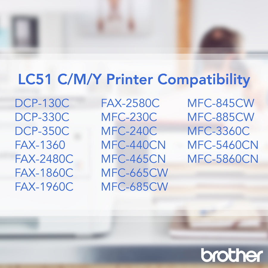 Color ink cartridges feature Innobella ink technology for print longevity, richer colors and sharper images. Innobella ink is fade-resistant and color-fast to deliver high-quality images that stay vivid for years. Cartridges are designed for use in the Brother DCP-130C, DCP-330C, DCP-350C, IntelliFax-1860C, IntelliFax-1960C, IntelliFax-2480C, IntelliFax-2580C, MFC-230C, MFC-240C, MFC-3360C, MFC-440CN, MFC-465CN, MFC-5460CN, MFC-5860CN, MFC-665CW, MFC-685CW, MFC-845CW and MFC-885CW. Three-piece pack includes cyan, magenta and yellow cartridges.