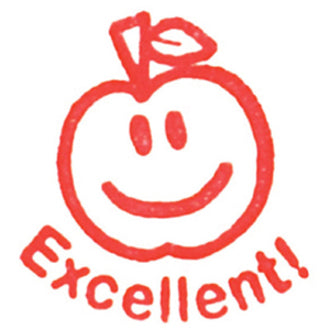Self-inking teacher's stamp delivers a red smiling apple with the red word "Excellent!" underneath. Works like a small printing machine. Just press down, and it prints, delivering hundreds of thousands of clear, crisp impressions. Self-inking from built-in stamp pads that contain nontoxic, water-based inks. Cartridge can be easily and cheaply replaced in seconds. Clear index window provides easy identification. Die-plate size is 1-3/16" x 1-3/16".