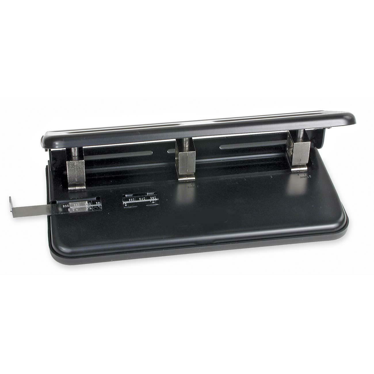 Heavy-Duty Three-Hole Punch drills three 9/32" holes in up to 30 sheets of 20 lb. bond. Distance between holes is adjustable. Includes paper centering guide and removable chip tray. Three-hole punch is made of steel.