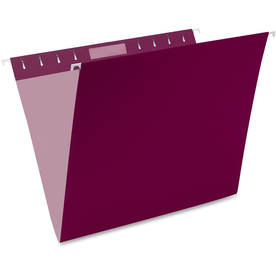 Colored hanging file folders help you organize your documents. Made with crimped style hanging rods for added strength, these durable folders handle multiple documents at a time. Folders offer 1/5-cut tabs and accent colored interiors to prevent misfiles. Eco-friendly design is made with post-consumer material to minimize environmental impact. File folders are perfect for storing files in offices, homes, schools and more.