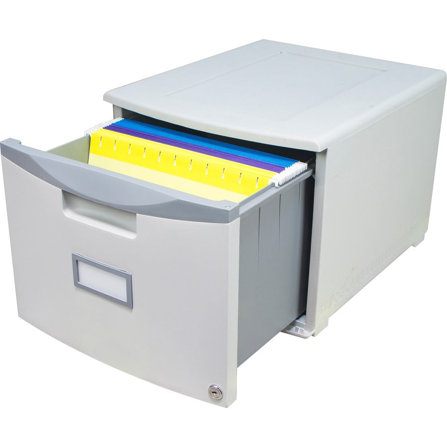 18" deep file drawer is scratch-resistant and dent-resistant. Channel tracks accommodate letter-size, hanging file folders. Included adapter is used for legal size hanging file folders. Drawer locks for security. Single-drawer design can be used under desk or stacked on top of double drawer using included adhesive tape. Drawer is washable and has a built-in label holder.