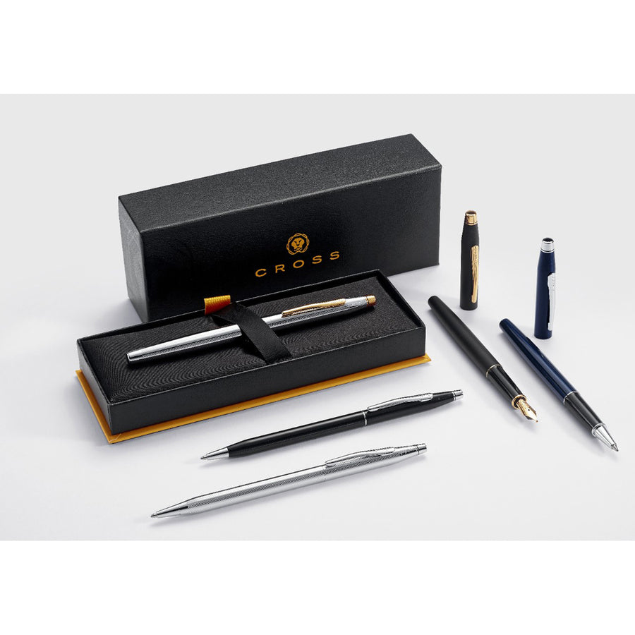 A striking combination of 23 karat gold appointments and polished chrome barrel, this set of pen and pencil is distinctive in appearance and renowned for smooth writing. Finish also offers a subtle, incised line pattern. The Classic Century Medalist Pen and Pencil Set features a sleek profile and patented twist-action barrel. Specially formulated Cross ink flows flawlessly for a superior writing experience. Pen includes one black, medium ballpoint refill. Pencil includes three pencil leads and one pencil eraser.