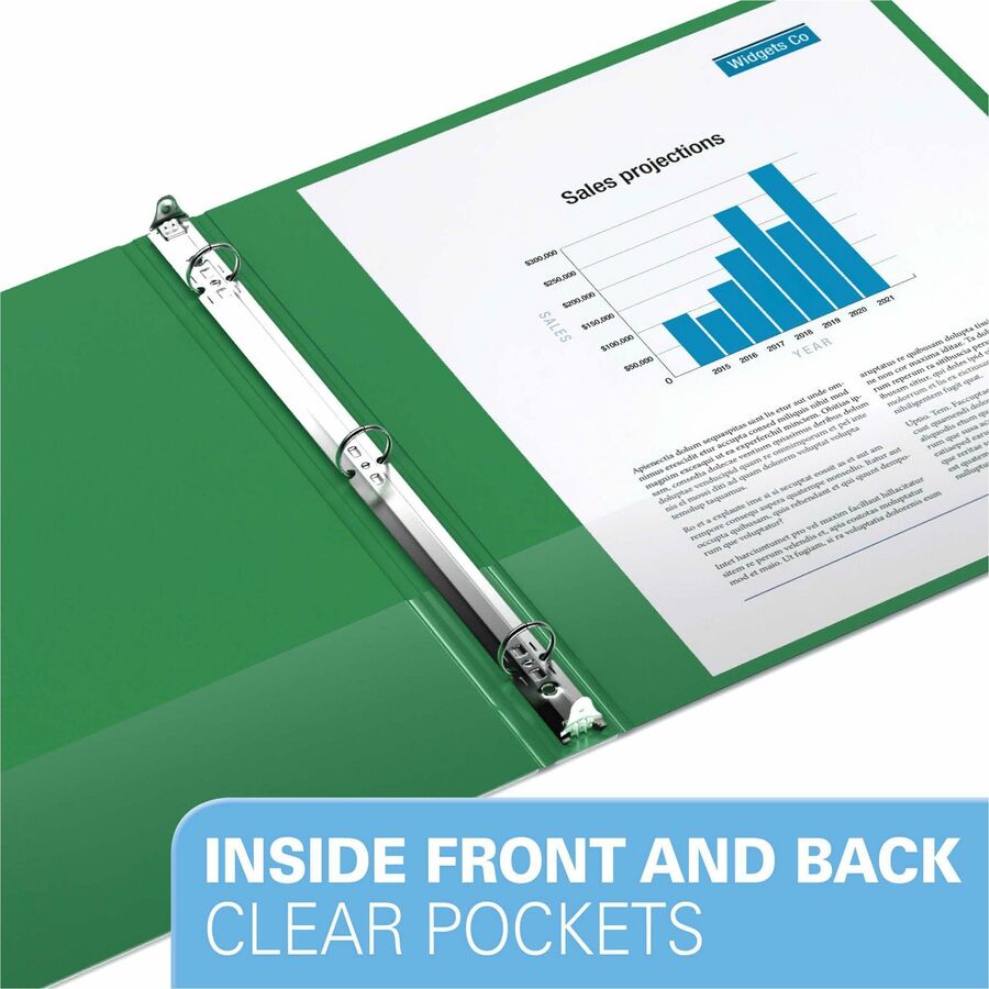 • 1/2" (12.70 mm) Binder Capacity - 8 1/2" (215.90 mm) x 11" (279.40 mm) Sheet Size - 100 Sheet Capacity - 3 x 0.63" (15.88 mm) Ring(s) - Fastener(s): Round Ring - Pocket(s): 2, Inside Front & Back - Polypropylene - Green - Recycled - 1 Each