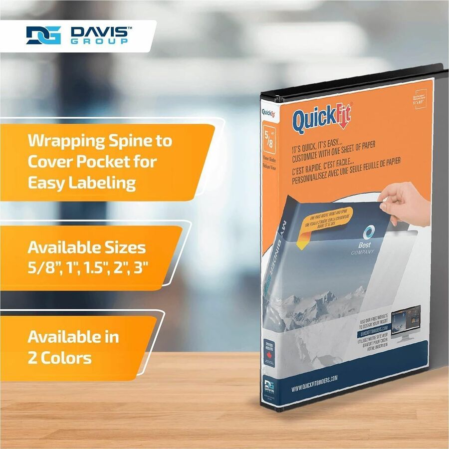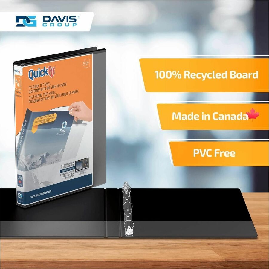 • Marketing Information: Organize your home, school, or office with the QuickFit View Binder. This 3-ring binder features a unique overlay design that allows you to use a single sheet of paper to design a custom decorative leaf insert that wraps around the spine to the front cover and helps you quickly identify your binder. This sturdy binder also includes 2 interior pockets: 1 inside the front cover and 1 inside the back cover. The pockets give you extra room to store small items that you don't want to punch holes in, such as artwork, blueprints, or note cards, and the clear ink-resistant material allows you to see what's in each pocket. Whether you're looking for a reliable school binder or a sleek professional binder, we have a QuickFit binder for you. Each binder is made in Canada from PVC-free polypropylene material. No matter your organizational needs, our binders will help you stay on top of every subject, deadline, and project. Davis Group is a privately owned Canadian company dedicated to providing premium-quality products. We are committed to environmentally friendly materials, and we craft each product to be high-quality, accessible, and environmentally conscious.