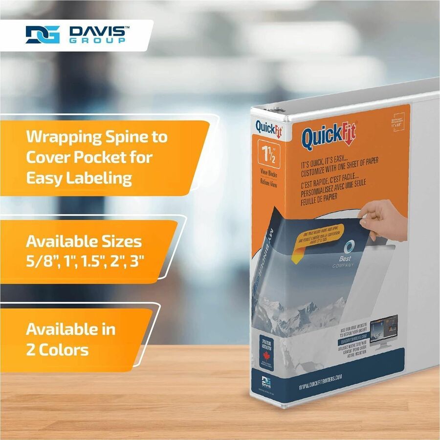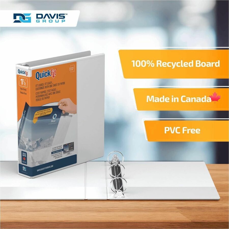 • Marketing Information: Organize your home, school, or office with the QuickFit View Binder. This 3-ring binder features a unique overlay design that allows you to use a single sheet of paper to design a custom decorative leaf insert that wraps around the spine to the front cover and helps you quickly identify your binder. This sturdy binder also includes 2 interior pockets: 1 inside the front cover and 1 inside the back cover. The pockets give you extra room to store small items that you don't want to punch holes in, such as artwork, blueprints, or note cards, and the clear ink-resistant material allows you to see what's in each pocket. Whether you're looking for a reliable school binder or a sleek professional binder, we have a QuickFit binder for you. Each binder is made in Canada from PVC-free polypropylene material. No matter your organizational needs, our binders will help you stay on top of every subject, deadline, and project. Davis Group is a privately owned Canadian company dedicated to providing premium-quality products. We are committed to environmentally friendly materials, and we craft each product to be high-quality, accessible, and environmentally conscious.