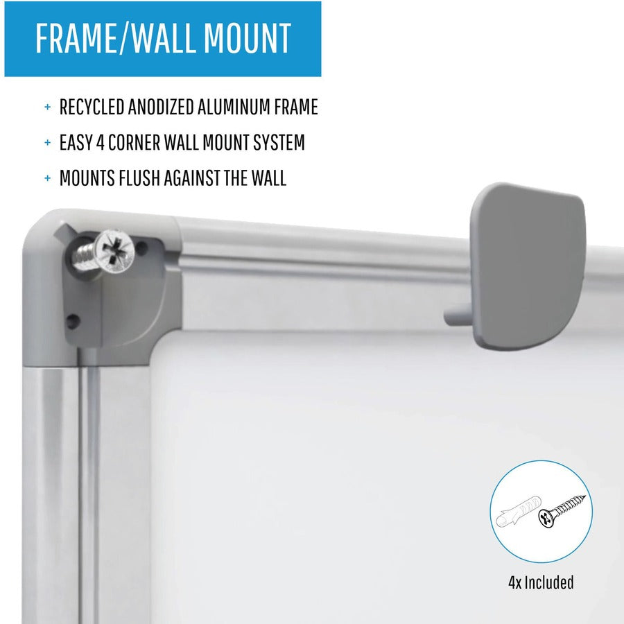 Earth Silver Easy-Clean Dry-Erase Board wipes clean every time. Everyday surface delivers minimal ghosting and staining. Frame is made of aluminum. Board is made with a high percentage of recycled materials. Board includes a marker tray and mounting hardware.