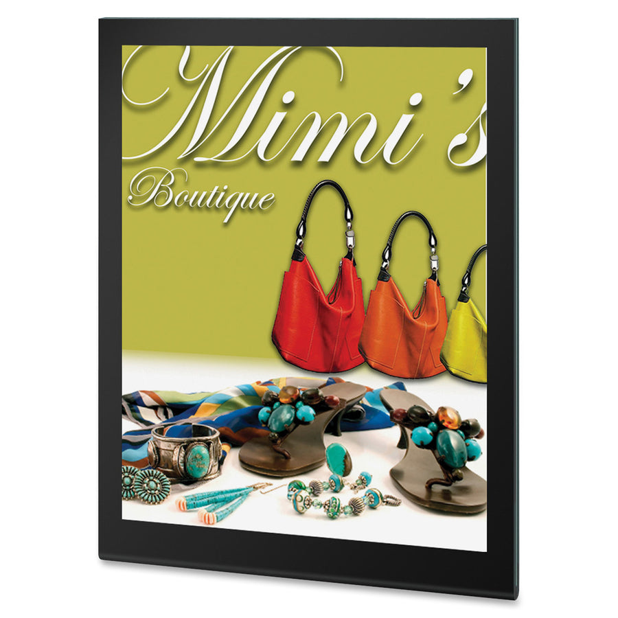 Wall-mountable sign holder features a permanent black border that frames your message and a clear panel for easy viewing. Literature slides into the portrait sign holder from the top or side. Superior Image Sign Holder accommodates 8-1/2" x 11" portrait-size inserts. Personalize and print signs from any office using Deflecto's free, online sign creator.