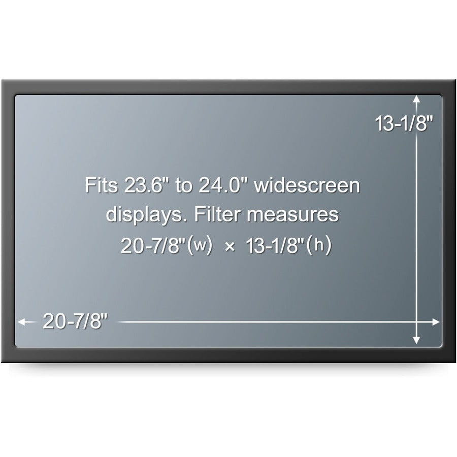Framed Desktop Monitor Privacy Filter offers outstanding privacy protection, allowing only those directly in front of the monitor to see on-screen data. Anti-reflective surface reduces screen glare. Filter fits 23.6" to 24" diagonally measured, wide-screen LCD desktop monitors. Actual filter viewing area dimensions are 20-7/8" wide x 13-1/8" high (530mm x 333mm). Attach with two easy-to-use methods: 3M Command adhesive and attachable hanger arms. Filter helps protect the display from scratches and fingerprints. Easy-to-clean surface is smudge-resistant and repels permanent marker.
