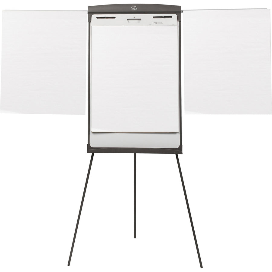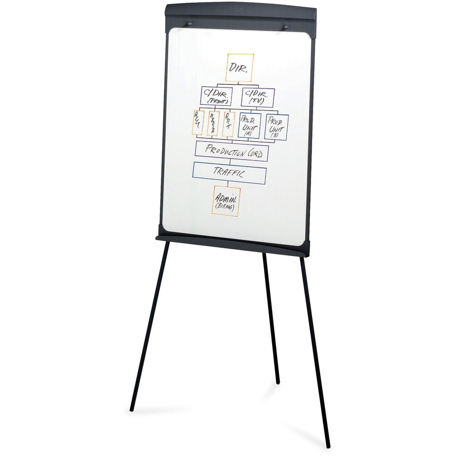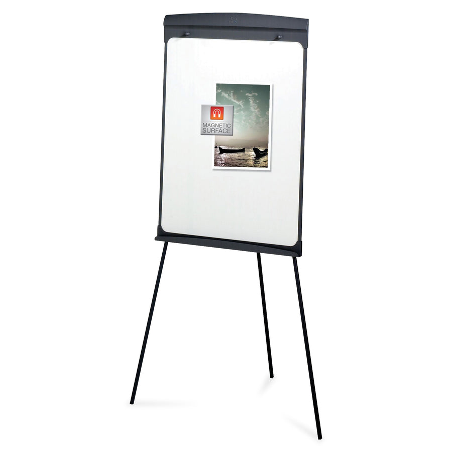 Sturdy tripod easel features a 27" x 35" magnetic marker board and flip chart pad retainer that holds any standard-size flip chart pad. Easel includes a full-length accessory tray and nonskid plastic feet that won't mar floors. Legs lock into place and fold for storage and easy transport. Tripod easel adjusts from 42" to 72" high for tabletop or floor use.