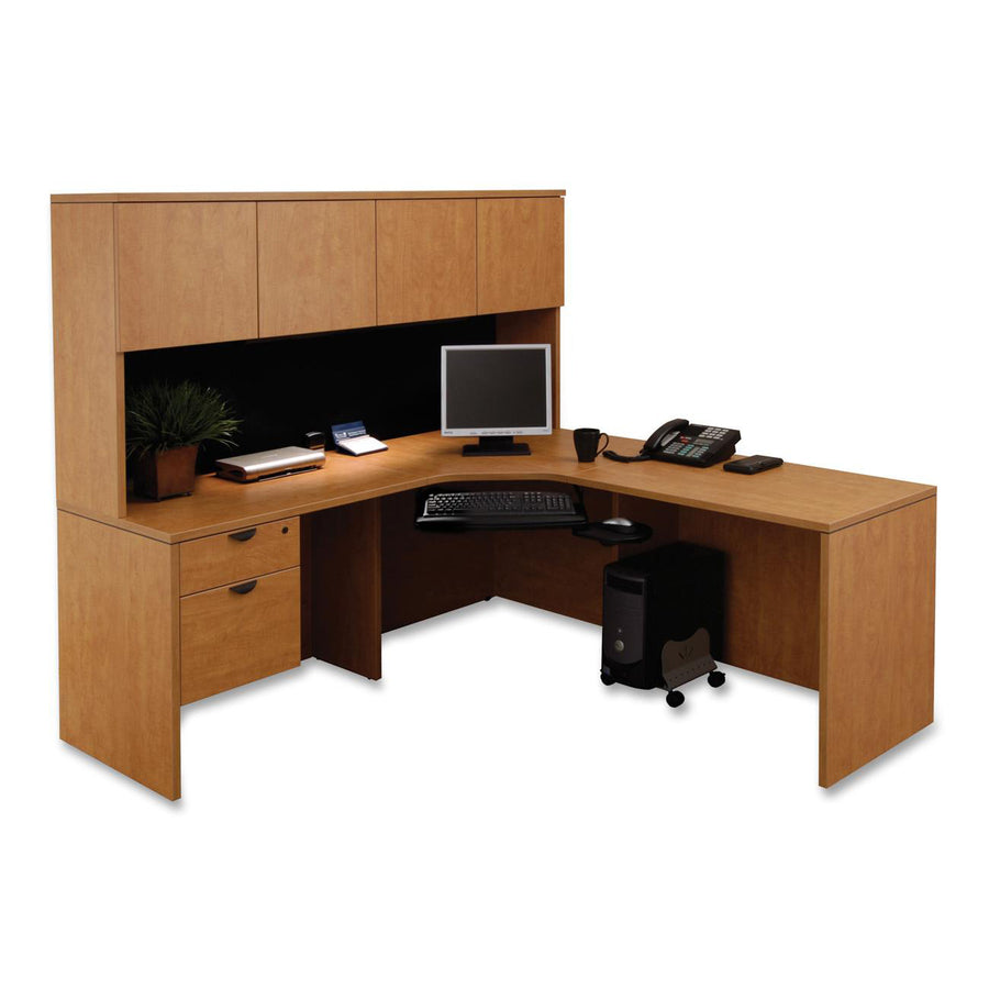 Left-Extended Corner Module is part of the Heartwood Innovations Laminate Series that combines intelligent design and function with lasting durability. Sugar Maple Laminate is water-resistant, scratch-resistant, dent-resistant and burn-resistant and requires little maintenance to keep it looking great. Durable, premium, thermally fused, woodgrain laminate tops 1" thick, 45 lb. industrial particleboard core. Tough, 3mm thick, PVC color-matched edging provides excellent wear-resistance. A black shadow strip is inserted below the top for a stylish accent. For more working space compared to other corner desks, the left side has an extended worksurface. The right side has a greater depth at 35-1/2". Left-side depth is 23-3/4". The 71" wide corner module includes a grommet for easy cord management, full flush modesty panel, and leveling glides so the desk can remain even on uneven surfaces. Pair with a Heartwood Innovations pedestal and hutch to add convenient storage options.