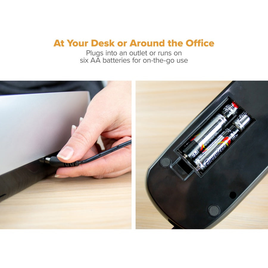 Electric three-hole punch delivers sleek, compact automatic punching wherever you need it. Push-button electric punch operates electronically when plugged in, or wire-free through battery operation. Precision hollow steel punch heads slice through up to 12 sheets of paper and create 9/32" holes. Adjustable paper guide accommodates various document sizes and ensures consistent hole-punch placement. Design also includes an easy-clean chip tray. Hole punch operates on six AA batteries (sold separately).
