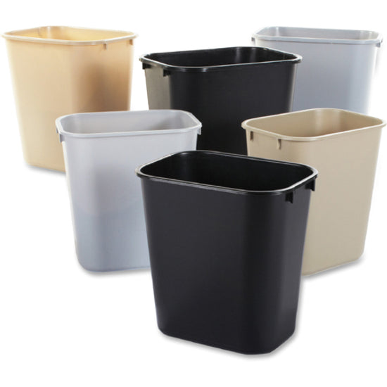 Space-efficient deskside wastebasket is durable and easy to clean. It fits under standard desk height even when a swing top (sold separately) is fully extended. All-plastic construction won't chip, rust or dent. Rolled rims add strength. Wastebasket will not mar furniture or floors.