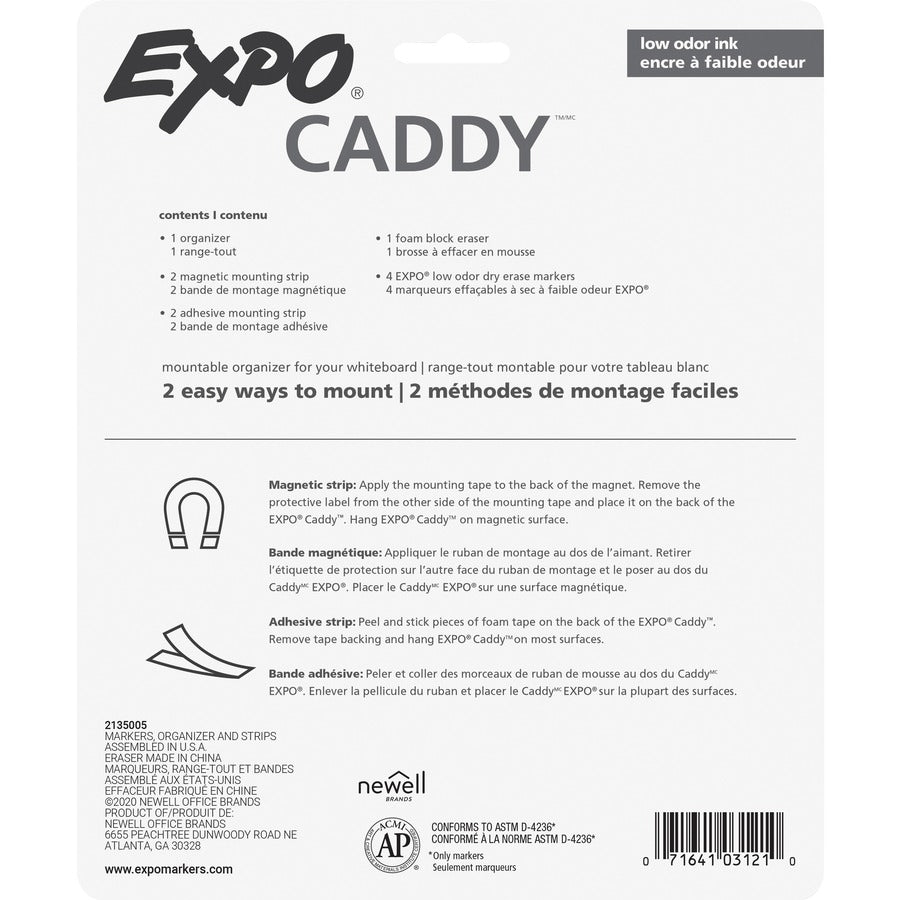 Caddy Organizer offers convenient accessory storage for any whiteboard. To reduce the impact of waste on the planet, the mountable five-piece organizer is made from a high percentage of recycled content. The low-odor, nontoxic marker formula is perfect for school and home use. Organizer includes four-low odor, certified AP nontoxic markers that conform to ASTM D-4236, and one foam block eraser. Caddy Organizer can be easily mounted with adhesive strips or magnetic strip to any board or surface. Caddy is suitable for all dry-erase boards.