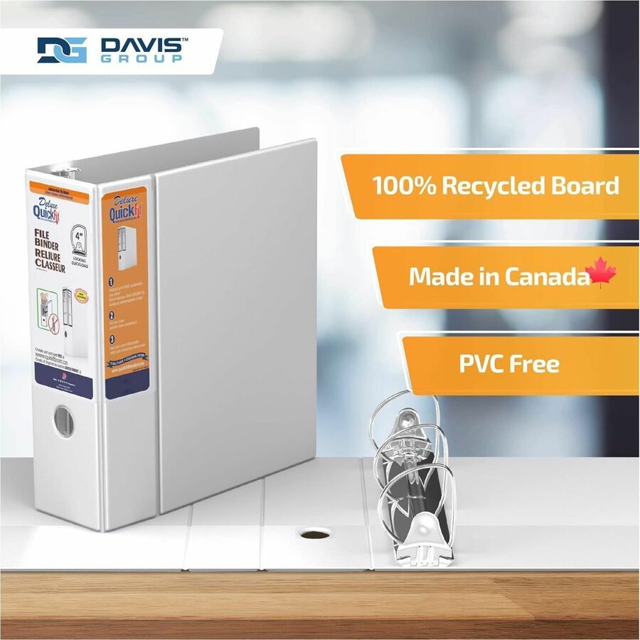 • Marketing Information: Organize your home, school, or office space with our QuickFit Heavy-Duty 3-Ring File Binder. From school plans to company data, each of your documents can have a designated place. This three-ring binder includes 2 interior pockets: 1 inside the front cover and 1 inside the back cover. The pockets give you extra room to store small items that you don't want to punch holes in, such as artwork, blueprints, or note cards, and the clear ink-resistant material allows you to see what's in each pocket. This durable binder also features a unique overlay design that allows you to use a single sheet of paper to design a custom decorative leaf insert that wraps around the spine to the front cover. An insert is easy to place and allows you to quickly identify your binder. Whether you need a college binder or a sleek professional binder, our QuickFit Heavy-Duty 3-Ring File Binder is the perfect fit. Whether you're looking for a small, medium, or large binder, there's a QuickFit binder for you. Each binder is made in Canada from PVC-free polypropylene material. No matter your organizational needs, our binders will help you stay on top of every subject, deadline, and project. Davis Group is a privately owned Canadian company dedicated to providing premium-quality products. We are committed to using environmentally friendly materials, and we craft each product to be high-quality, accessible, and environmentally conscious.