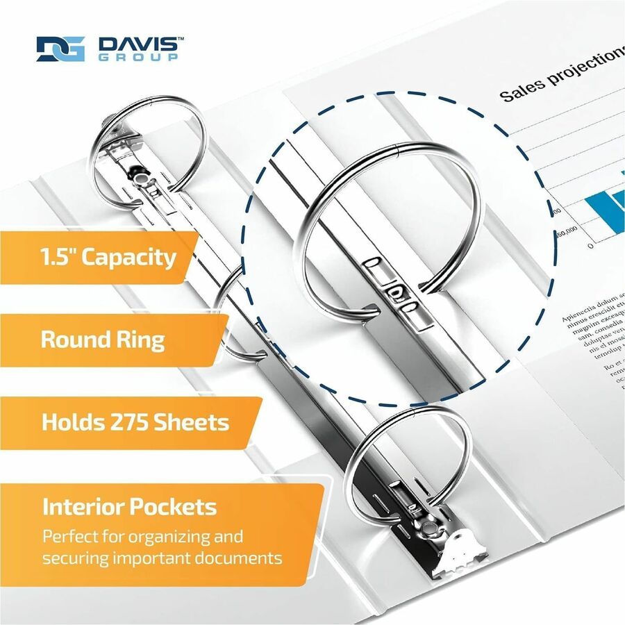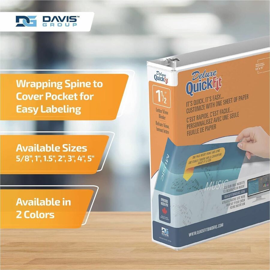 • Marketing Information: Organize your home, classroom, or office space with our QuickFit binder. It is ideal for holding larger presentations and can accommodate 8 1/2-by-11-inch sheets of paper without folding them. From artwork to company data, each of your documents can have a designated place. This 3-ring binder includes 2 interior pockets: 1 inside the front cover and 1 inside the back cover. The pockets give you extra room to store small items that you don't want to punch holes in, such as artwork or note cards, and the clear ink-resistant material allows you to see what's in each pocket. This binder also features a unique overlay design that resists ink transfer and allows you to use a single sheet to create a one-piece custom decorative insert that wraps around the spine to the front cover. Whether you need a reliable school binder or a sleek professional binder, our durable clear-view binder is the perfect fit. Whether you're looking for a small, medium, or large 3-ring binder, there's a QuickFit for you. From large company ledgers to small business portfolios, our horizontal binders will secure and organize your information in all one place. Each binder is made in Canada from PVC-free polypropylene material. No matter your organizational needs, our binders will help you stay on top of every subject, deadline, and project. Davis Group is a privately owned Canadian company dedicated to providing premium-quality products. We are committed to environmentally friendly materials, and we craft each product to be high-quality, accessible, and environmentally conscious.