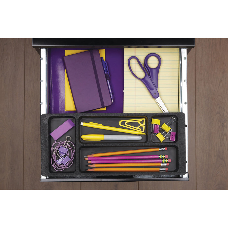 SOHO File Cabinet offers convenient storage of files and supplies with an accessory drawer on top and two file drawers with smooth-glide suspension. The accessory drawer is perfect for cell phones, tablets, cables and small supplies. Full high-side drawers accommodate letter-size, hanging file folders. The lock secures the two top drawers. Four casters allow you to move the pedestal where you need it. Three-drawer organizer also includes an 18" depth, recessed plastic handles and steel construction with a baked enamel finish.