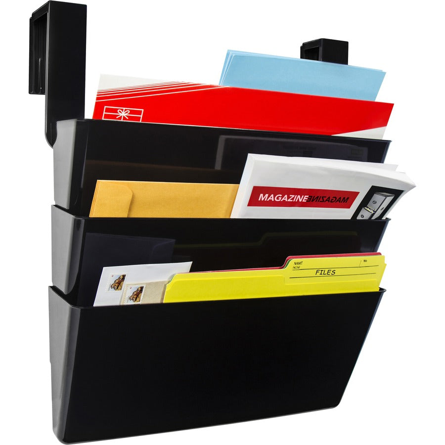 Three files maximize limited space by positioning one over the other. Brackets adjust to hang unit over panels, partitions or doors up to 3-1/2" thick. Ideal for storing, organizing and keeping off your desk yet close at hand file folders, catalogs, printouts, clipboards, patient charts and much more. Each pocket holds up to 4" worth of material. Hanging file is made of post-consumer recycled plastic.