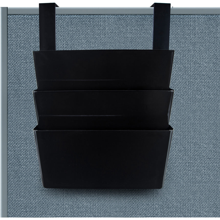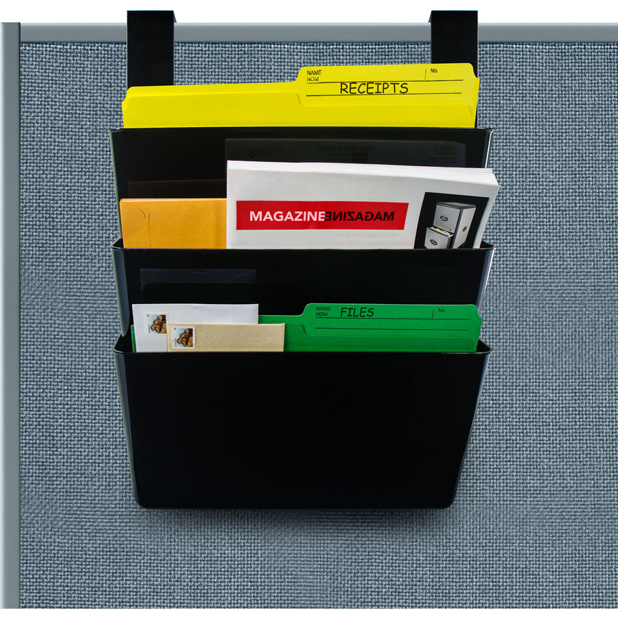 Three files maximize limited space by positioning one over the other. Brackets adjust to hang unit over panels, partitions or doors up to 3-1/2" thick. Ideal for storing, organizing and keeping off your desk yet close at hand file folders, catalogs, printouts, clipboards, patient charts and much more. Each pocket holds up to 4" worth of material. Hanging file is made of post-consumer recycled plastic.