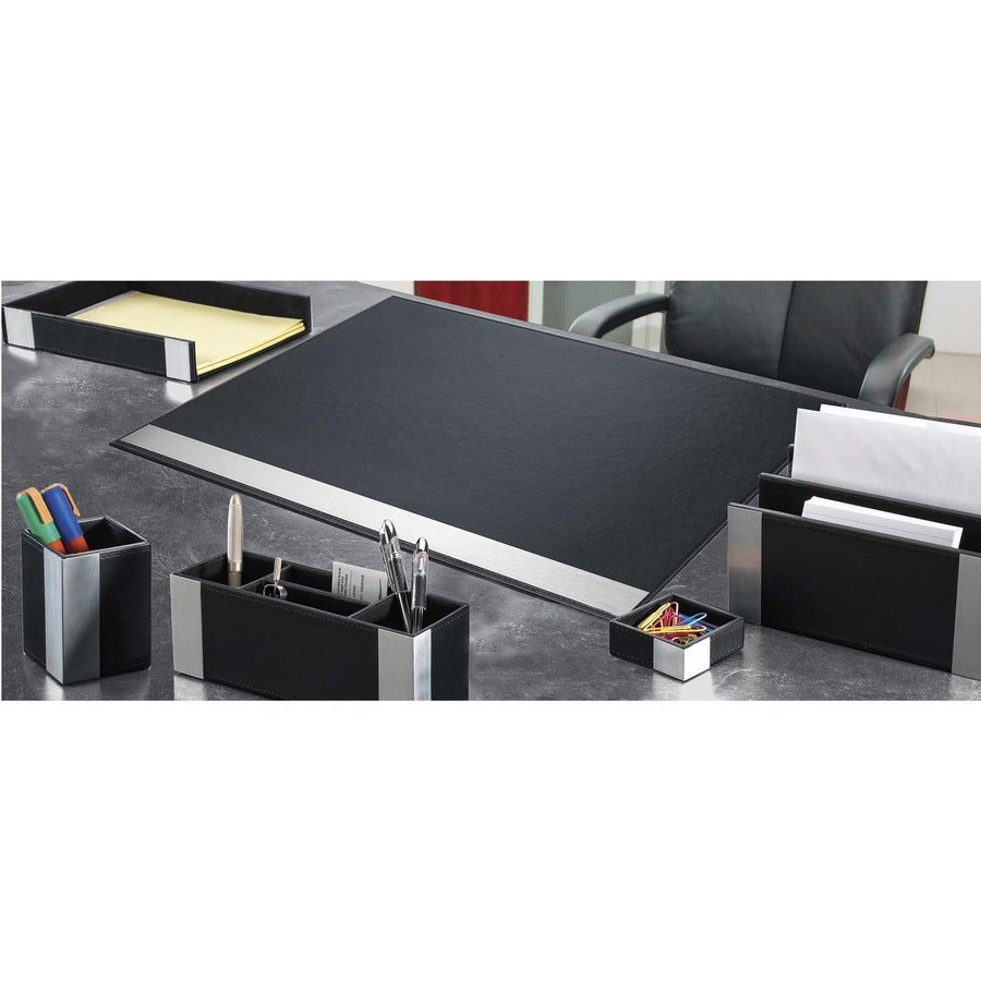 This letter sorter features an attractive brushed aluminum trim that adds the rich look and feel of leather to your desktop work space. Letter sorter provides separate sections, helping to organize incoming and outgoing mail, checks or small papers. Bound in a stitched, black leatherlike material with vertically brushed metal accents, the contemporary design adds a clean and custom look to your desktop or work space. Letter sorter also features a soft, velvet-like lining and contrasting white stitching, adding a rich, distinctive touch. The rigid construction ensures that you get a durable product that will last for years.