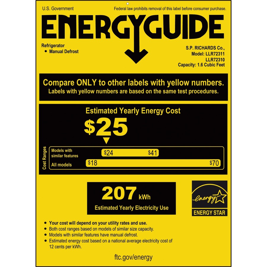 Compact refrigerator is perfect for your personal office use. With the reversible door, flush-back design and adjustable leveling legs, you can fit it easily into your work area. The 1.6 cubic feet of nonlocking refrigerated storage offers a chiller section, wire shelf extension, bottle rack with space for a 2-liter bottle in the door and smaller door shelf for small items. Full-range thermo dial control lets you determine the temperature. ADA-compliant refrigerator also includes recessed handle and manual defrosting. UL approved. Energy Star qualified.