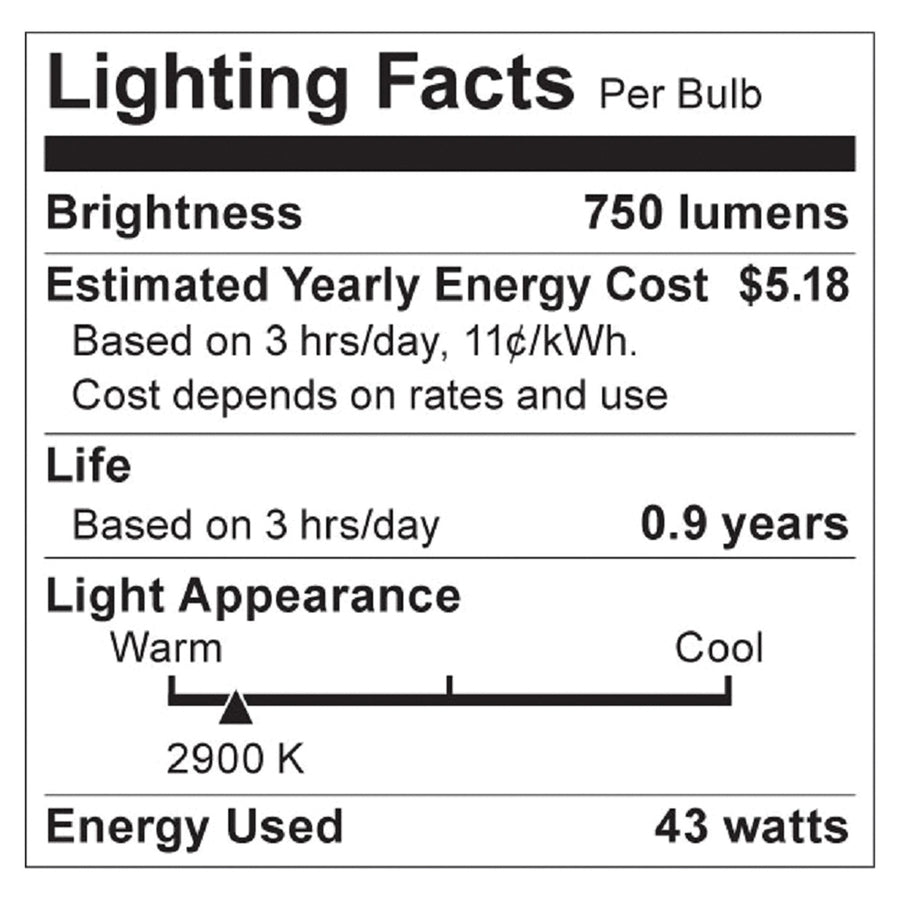 A19 halogen bulb features Xenon technology to offer an enhanced performance that saves you energy. 43-watt, dimmable bulb produces the same light output of a 60-watt incandescent bulb. Designed with a familiar shape, this halogen bulb produces 750 lumens at 2,900 Kelvin. 120-volt bulb features a medium base and shines a crisp, white light for 1,000 hours. RoHS compliant.