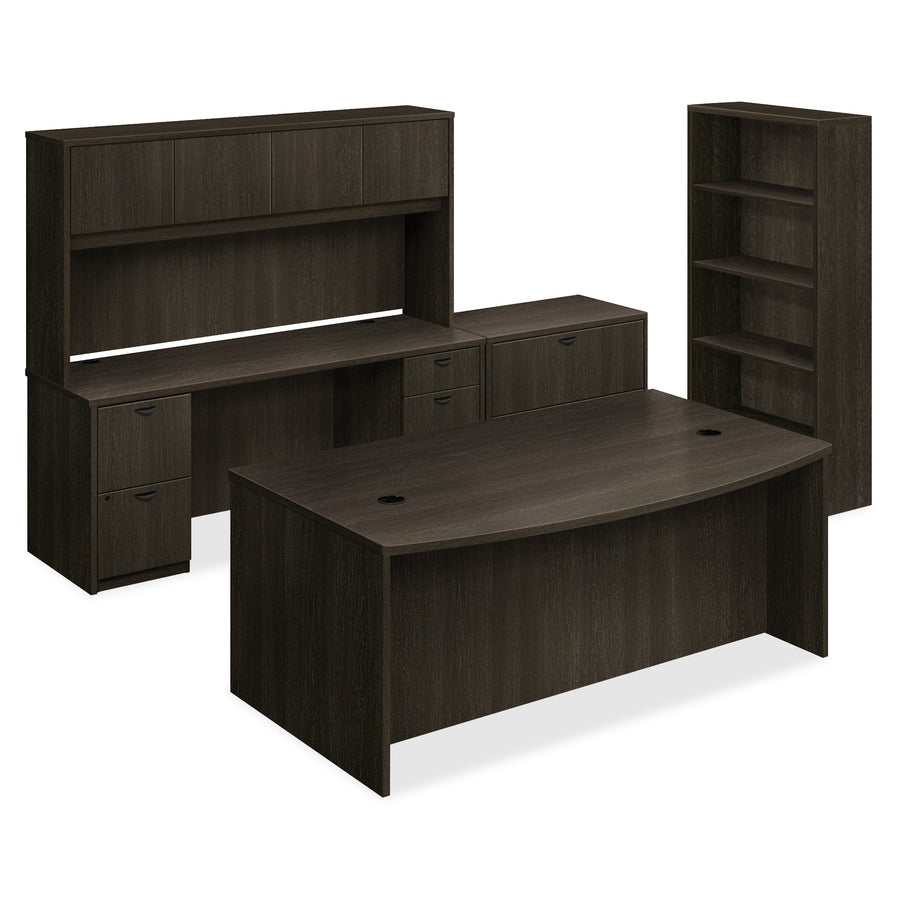 Peninsula with end panel is part of the HON BL Laminate Furniture Collection that delivers a professional look on a budget. Tough, affordable and practical, this collection simply makes sense, helping you get the job done without a lot of bother. Durable, 1" thick top is covered with abrasion-resistant, stain-resistant, thermal-fused, Espresso laminate. Adjustable floor-leveling glides provide 1/2" of adjustment.
