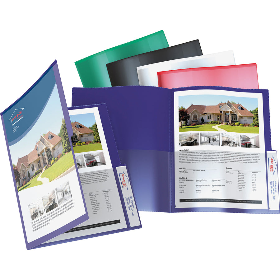 Keep your projects organized with QuickFit project file folders. Fully customizable covers allow you to create a personalized look for your notes. Clear view tab helps you quickly locate what you need for easier filing. Tear-resistant polypropylene keeps your important documents safe when stored or traveling. Clear interior pockets provide a convenient location to store loose papers and documents.