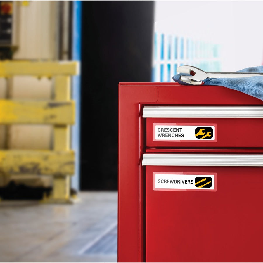 Easy Align Self-Laminating ID Labels are tough enough to withstand harsh conditions. You won't have to tape over your labels or use a lamination machine. These labels come with a clear laminate that's easy to apply. With the Easy Align design, you can create perfect, laminated labels without bubbles or wrinkles every time - no lamination machine required. The material is UV-resistant, providing extra protection against exposure to sun and other harsh environments. They're also water-resistant so surfaces can be wiped clean. Labels resist scuffing, tearing and smudging so they remain intact and easy to read. The permanent adhesive sticks to a variety of surfaces, including plastic, wood, metal, paper, ceramic and glass. Use them to mark your property and equipment, identify contents of containers and organize shelving in warehouses, storage areas and worksites. Rectangular labels are compatible with laser and inkjet printers. Each sheet includes 10 labels (3-1/2" x 1-1/32").