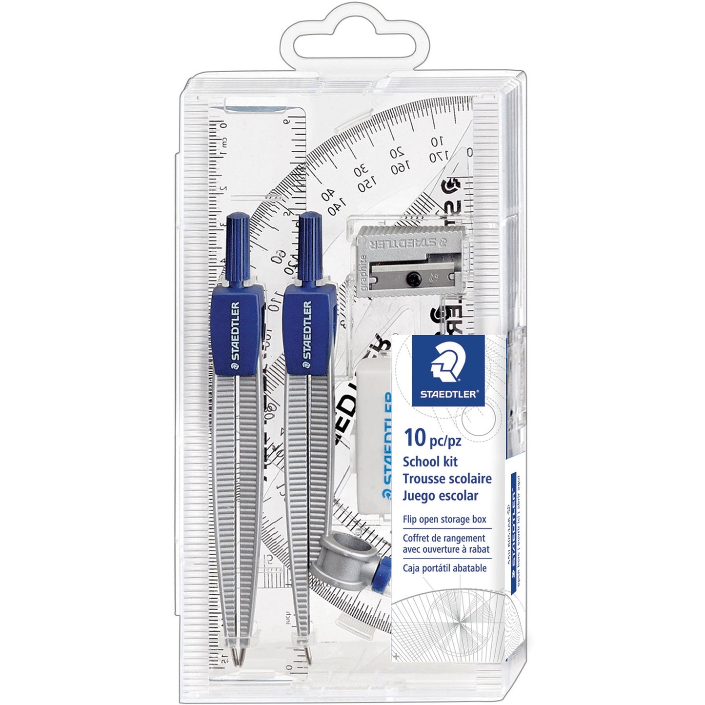 Math set features essential tools to let your students perform a variety of measurements in the classroom. Transparent protractor, ruler and triangles allow items to show through for precise measurements. Sharply defined graduations on the measuring tools prevent reading errors for accurate use. Plus, writing is simple with the pre-sharpened pencil, eraser and sharpener. Flip-open storage box keeps all of your tools neatly organized for safe storage between uses. Set includes a compass, divider, eraser, triangles, protractor, ruler and sharpener.