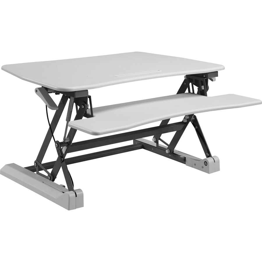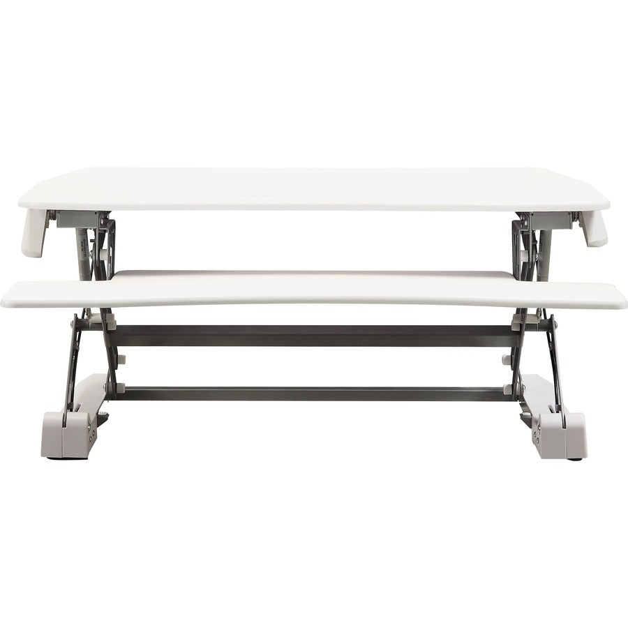 Desk riser allows you to go from sitting to standing with ease. Stop at any position from 6-1/4" x 19-1/2" when adjusting the height. Desk riser operates with a double gas-spring monitor lift for smooth, easy ascension. The top worksurface includes a convenient iPad/iPhone slot. Quick-release keyboard tray provides easy reach to your keyboard even when standing and can detach easily when necessary. Keyboard tray is curved slightly for easy, ergonomic access to your keyboard while maintaining ample room on both sides for your mouse or other supplies. The frame is made of sturdy steel. Worksurface and tray are made of medium-density fiberboard with PVC finish.