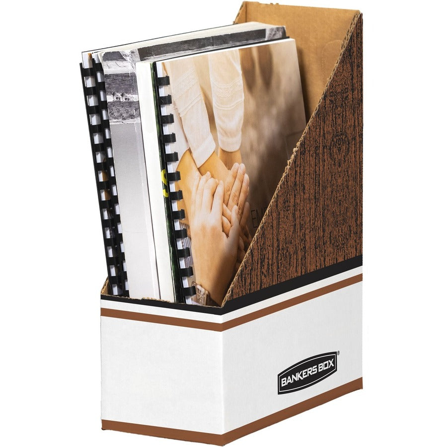 Use durable magazine files for daily reference. Premium corrugated construction with glued side panels withstands heavy day-to-day usage. Each file organizes and stores a variety of standard letter-size magazines, catalogs, file folders, project binders and periodicals. Easy-to-assemble magazine file contains a high percentage of recycled material.