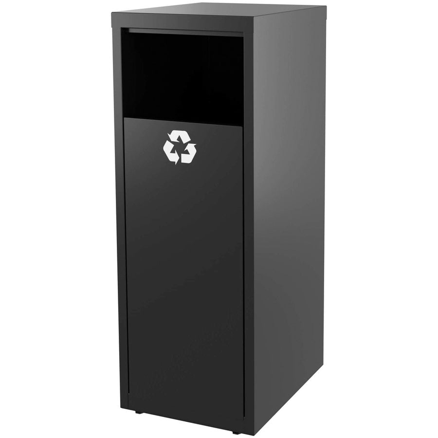 Designed to blend with existing office furniture, this stylish recycling tower adds function to any business environment. A 10-gallon trash bin is included along with decals to designate units for trash or recycling. Hidden storage compartment offers a convenient location to store your trash bags and cleaning supplies.