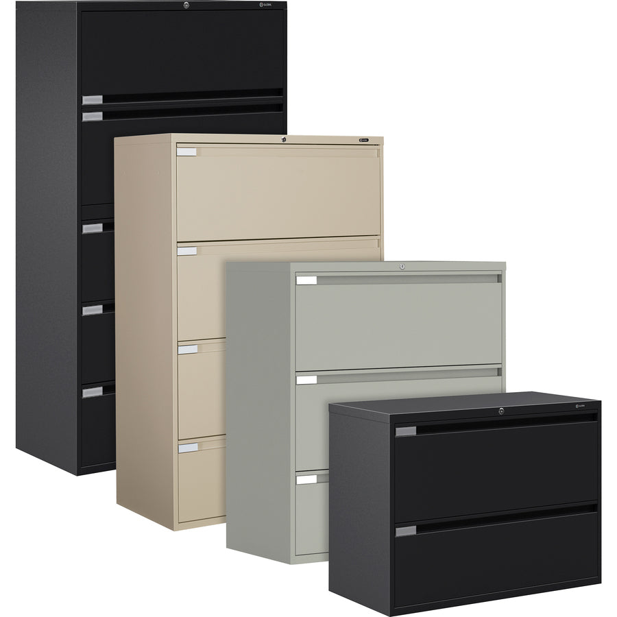 Fileworks Lateral File features a full-length pull handle and a fixed front. Looped full pull allows convenient opening and displays an upscale appearance. Smooth, seamless welded corners provide lasting strength and durability. Side-to-side hanging file bars are included for filing letter-size or legal-size documents. Standard lock with removable core is perfect for keying alike. Standard lock bars on both sides of cabinet provide increased security. Positive interlocking system prevents tipping by allowing only one drawer to open at a time. Standard leveling glides ensure drawers are easy to open. Earth-friendly, electrostatically applied coating protects the environment and provides a durable finish.