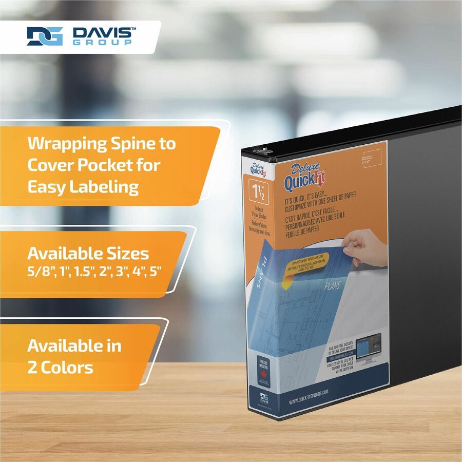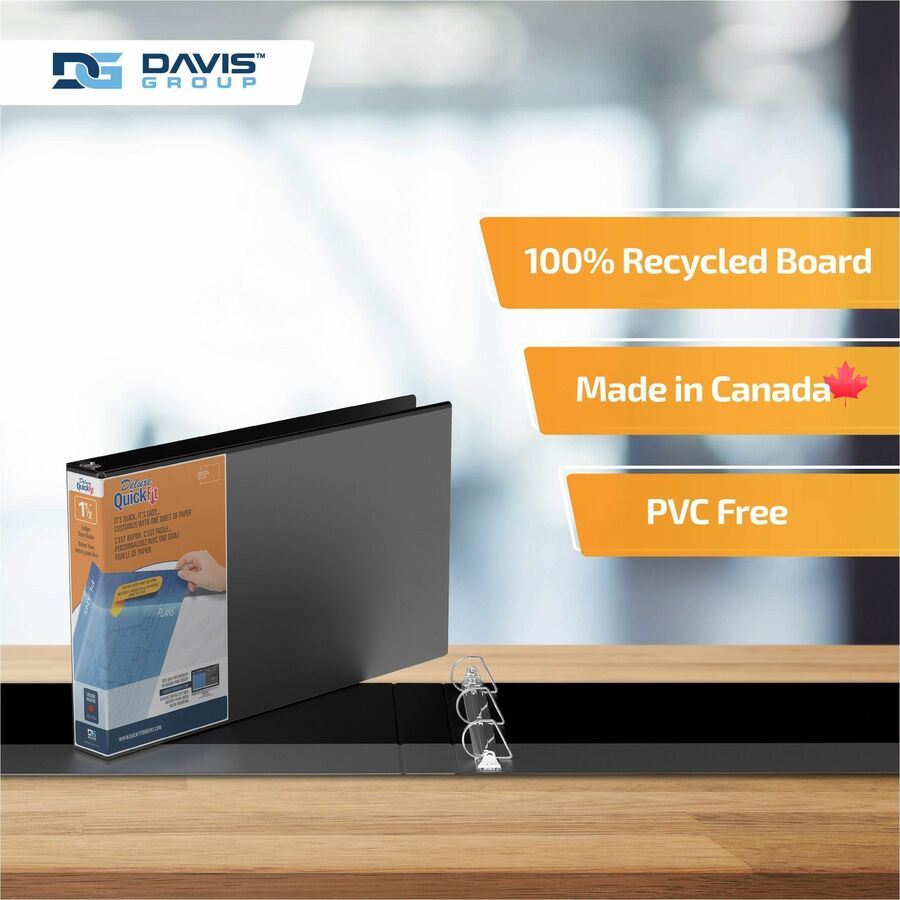 • Marketing Information: Organize your home, classroom, or office space with our QuickFit binder. It is ideal for holding larger presentations and can accommodate 11-by-17-inch sheets of paper without requiring them to be folded. From artwork to company data, each of your documents can have a designated place. This three-ring portfolio binder includes 2 interior pockets: 1 inside the front cover and 1 inside the back cover. The pockets give you extra room to store small items that you don't want to punch holes in, such as artwork or note cards, and the clear ink-resistant material allows you to see what's in each pocket. This binder also features a unique overlay design that resists ink transfer and allows you to use a single sheet to create a one-piece custom decorative insert that wraps around the spine to the front cover. Whether you need a reliable construction-plan holder or a sleek professional binder, our durable clear-view binder is the perfect fit. Whether you're looking for a small, medium, or large 3-ring binder, there's a QuickFit for you. From large company ledgers to small business portfolios, our horizontal binders will secure and organize your information all in one place. Each binder is made in Canada from PVC-free polypropylene material. No matter your organizational needs, our binders will help you stay on top of every subject, deadline, and project. Davis Group is a privately owned Canadian company dedicated to providing premium-quality products. We are committed to using environmentally friendly materials, and we craft each product to be high-quality, accessible, and environmentally conscious.