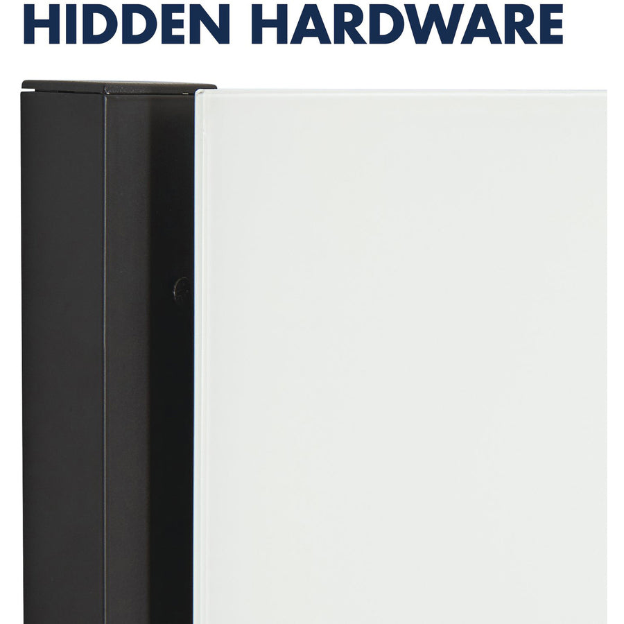 Glass dry-erase board features a tempered glass surface that resists stains and ghosting for excellent erasability. Magnetic glass can be used with magnets to post messages and papers. Aluminum frame on the sides of the board sits slightly behind the board surface for a unique, layered look with professional appeal. Stylish accessory tray is permanently attached below the board surface and is slanted to prevent markers from rolling off.