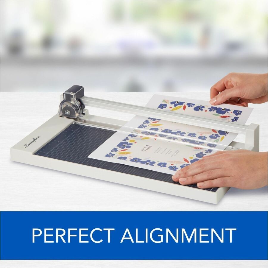 Rotary cutting action with concealed stainless steel blade. Heavy-duty steel base has both metric and imperial measurements Features an alignment grid, dual scale ruler and transparent cutting guide. 12". Cuts up to 10 sheets of 20 lb. paper.