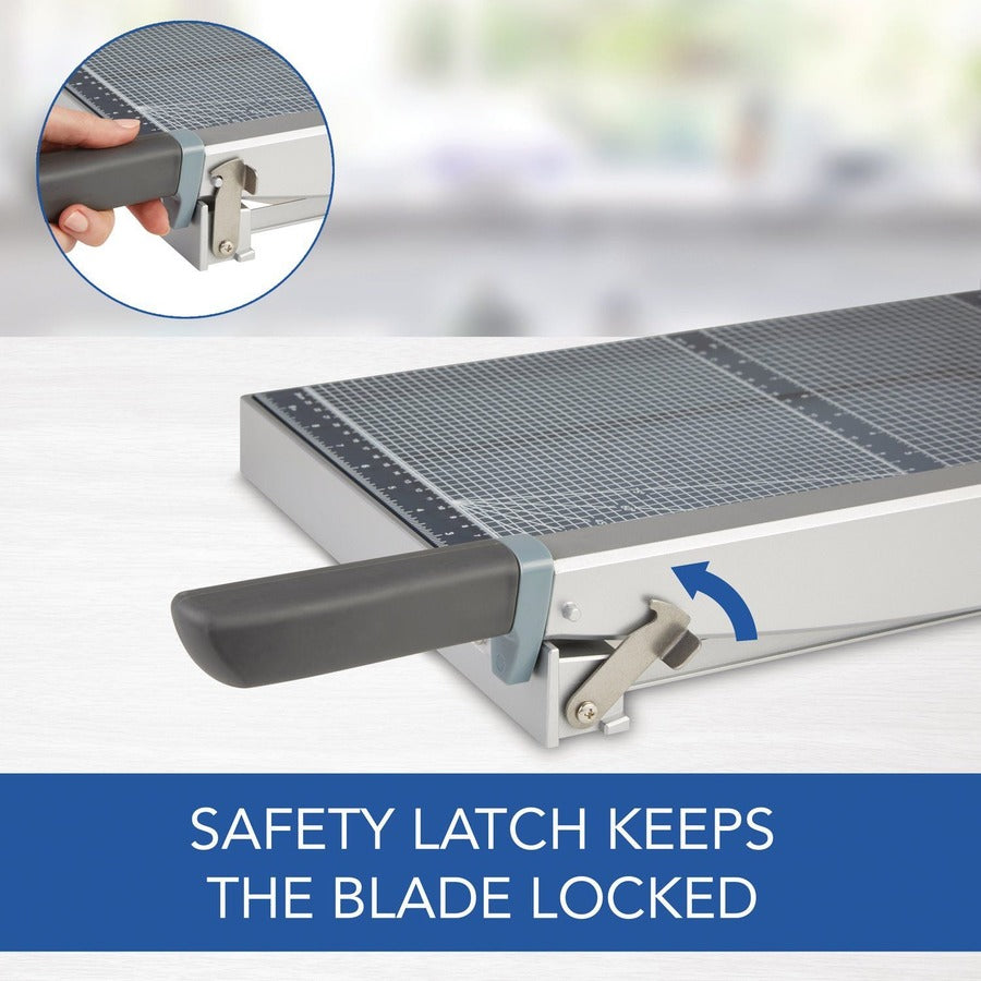 Take the guesswork out of trimming with the Swingline ClassicCut Glass Guillotine Trimmer. With EdgeGlow LED illumination, it's easy to align to your papers for a perfect cut. Simply lift the blade and line your paper up with the light guide for clear and accurate trimming. This trimmer has a thick, tempered glass surface and is printed with alignment guides to help improve trimming accuracy. The deep guillotine blade has a 15" cutting length and can trim up to 15 sheets at once. Plus, a safety latch keeps the blade in place when it's not in use. A sturdy plastic frame securely holds the trimmer in place. The EdgeGlow LED light requires 3 AAA batteries, which are included for your convenience. Trimmer comes with a 5 year warranty.