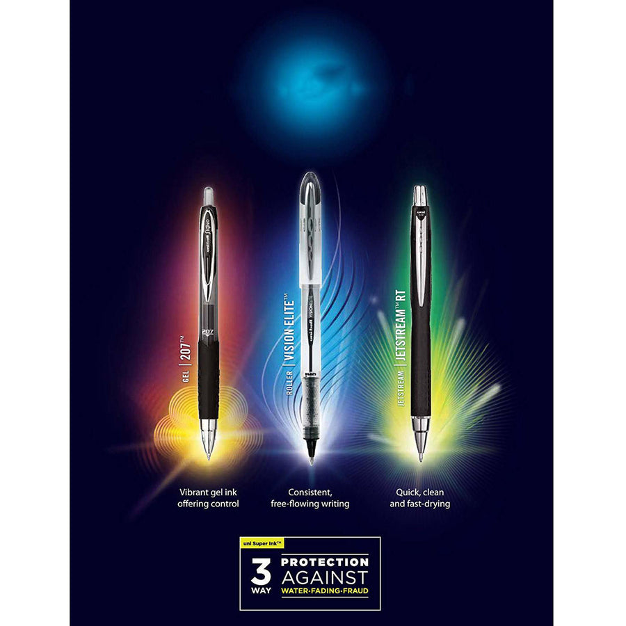 The Jetstream RT writes amazingly smooth like a gel, yet dries quickly like a ballpoint. Retractable pen contains Uni Super Ink, a specially formulated ink that helps prevent a common form of check fraud known as "check washing." Embossed grip provides maximum control. Quick-drying ink helps avoid smearing and is fade-resistant and water-resistant. Metallic accents give Jetstream an unparalleled statement of style.