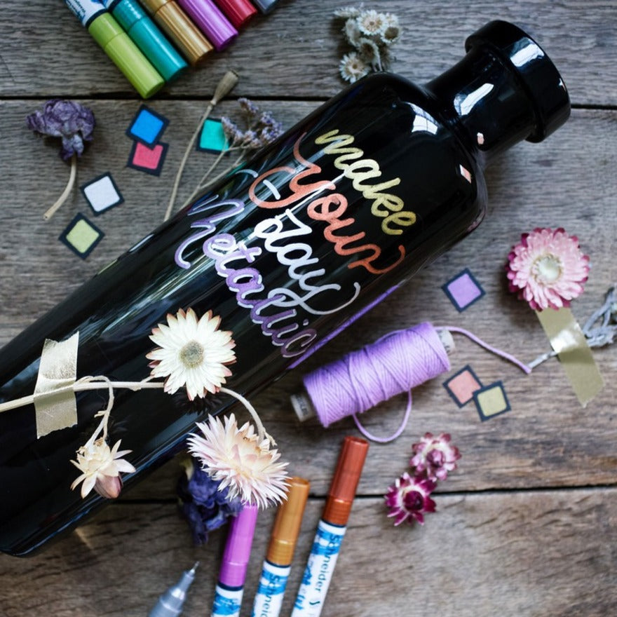 Metallic marker for extraordinary effects. Gives every project a special appearance. Fine line width approx. 2.0 mm. Ink colour silver metallic gold metallic copper metallic violet metallic. New pigment technology enables a clean and homogeneous colour application. The aluminium flakes coated with colour pigments produce a highly metallic effect with an exceptionally high gloss level, even in different incidences of light. Suitable for many surfaces. Best results on dark and non-absorbent surfaces. Fast-drying ink perfectly controlled by a valve.