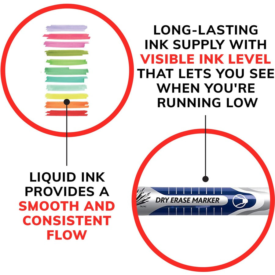 Make your ideas easy to read and understand with BIC Intensity Advanced Dry Erase Markers. These bullet tip dry erase markers have a 4.2 mm bullet tip that creates neat, precise lines, making them perfect for detailed writing. Featuring liquid ink, BIC Intensity Advanced Whiteboard Markers provide a smooth and consistent ink flow, mark clearly on whiteboards and other non-porous surfaces, and erase easily for quick cleanup. The long-lasting ink in these dry erase board markers allows for hours of uninterrupted writing. Plus, the ink supply is visible via a clear window in the barrel, so you can always see when you're running low. Looking for skinny dry erase markers for office or teachers supplies? Non-toxic and ACMI-approved, BIC Intensity Advanced low odour dry erase markers are ideal for work, school or home. They're great for brainstorming sessions, presentations, lessons, calendars, chore charts and more. This pack contains 4 colourful dry erase markers in black, blue, red and green. Feel prepared and confident for your next whiteboard session with BIC Intensity Advanced Fine Tip Dry Erase Markers.