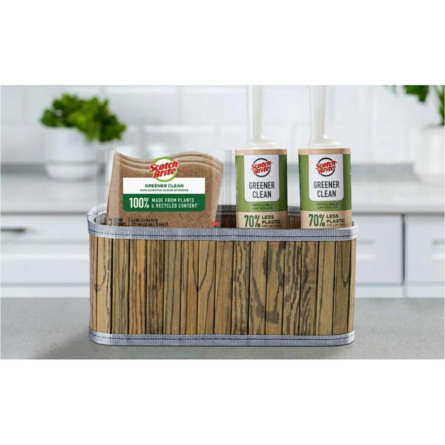 Go greener with the Scotch-Brite™ Greener Clean™ Lint Roller. The Greener Clean™ Lint Roller uses 70% less plastic, but has the same great pickup* that you have come to expect from Scotch-Brite™. This refillable lint roller features a 100% recycled handle and the only paper lint tape made with Scotch Brand adhesive. The Scotch-Brite™ Greener Clean™ Lint Roller is great for use in the home, office, or classroom and works great against pet hair. The rolling surface means you can make quick touchups on-the-go. The Scotch-Brite™ Greener Clean™ Lint Roller handles are made from 100% recycled water jugs. The recycled plastic from one water jug equals two of the lint roller handles. Roll away the mess with the Scotch-Brite™ Greener Clean™ Lint Roller.