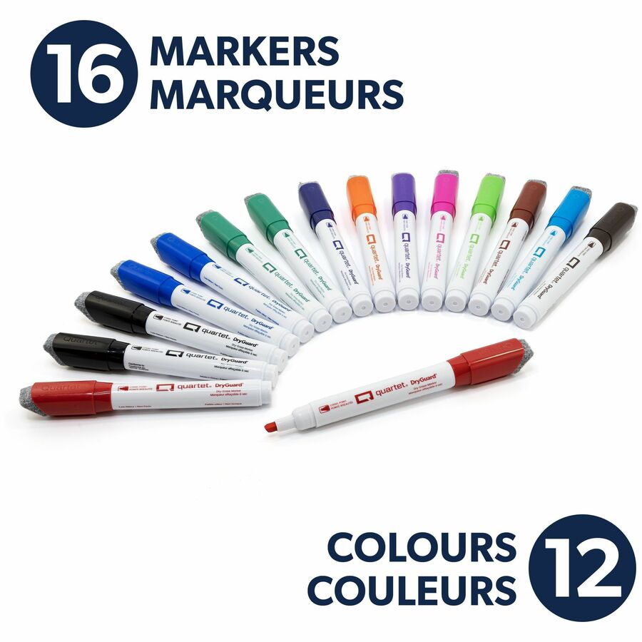 Enjoy the perfect blend of performance and convenience with Quartet DryGuard Dry Erase Markers! Designed with innovative DryGuard™ Ink Protection, these markers remain vibrant and ready to use-even if left uncapped for up to 24 hours. The magnetic eraser cap offers a built-in eraser for quick corrections and easily attaches to any magnetic surface, keeping your workspace tidy and your tools within reach. Plus, with a low-odour, non-toxic formula that meets ASTM D-4236 safety standards, you can enjoy a smooth, pleasant writing experience every time. Quartet, the Ultimate Dry-Erase Experience!