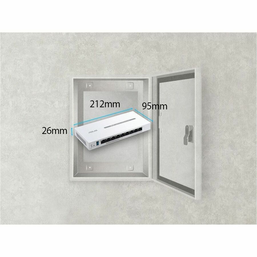 The compact ExpertWiFi EBG19P, at 212 x 95 x 26 mm, fits in the low voltage wiring box. Its site-to-site VPN enables secure connections and resource sharing across locations. With two WAN/LAN ports and a USB port for backups, it ensures stable connectivity.