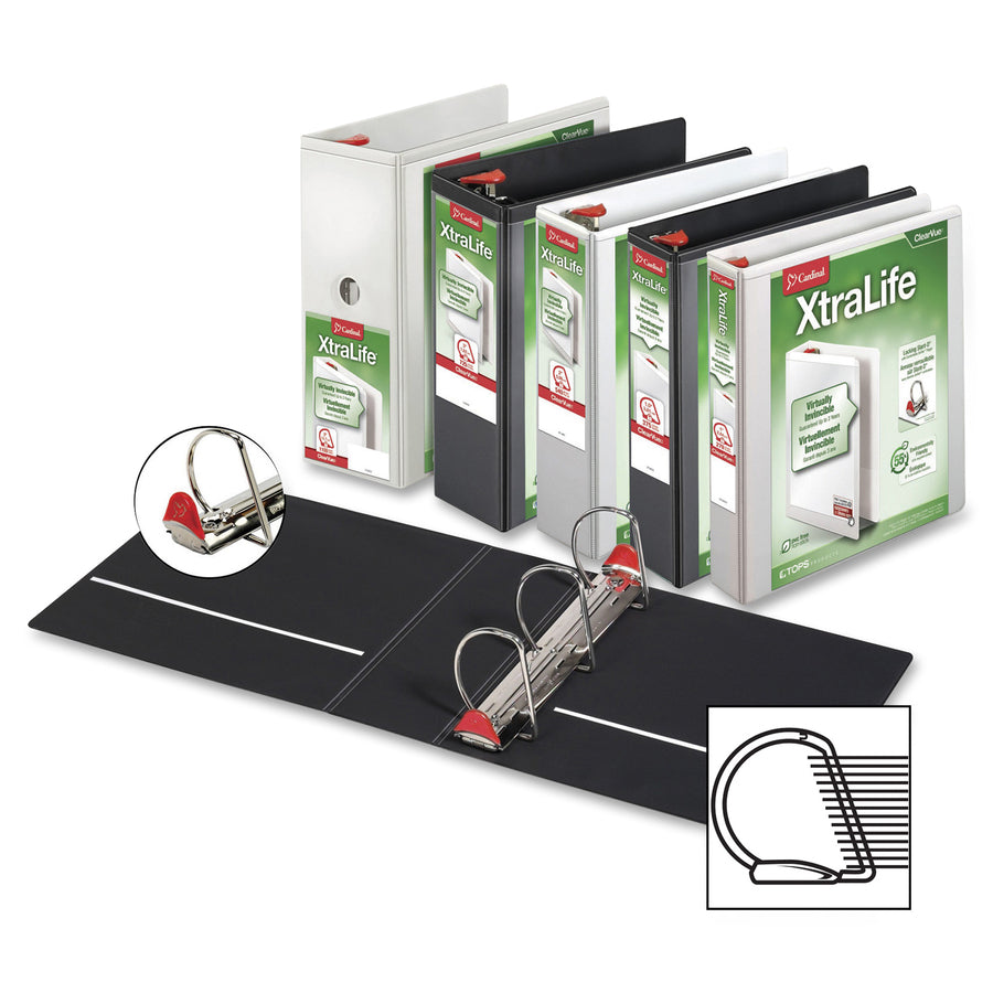 View binder features a unique XtraLife material that will not stick to cover title insert or materials stored inside, including photos, laser prints and photocopies. Material is much stronger than standard vinyl so no seam splitting and hinge tearing. Unique, PVC-free polyolefin cover material is better for the environment when produced and disposed than vinyl. Nonstick cover offers a clear, nonglare overlay on three-sides for easy customization. Designed to endure extreme temperatures, this binder is cold-crack tested to negative 50 degrees Fahrenheit. Locking Slant-D rings hold 25 percent more letter-size material than standard round rings while GelTab triggers make it comfortable to operate. Back-mounted steel rings provide a clean, professional spine and reduce wear. 5" ring capacity holds 1,100 sheets. Horizontal pockets on the inside front and back covers hold loose papers. Each pocket holds 40 sheets. Binder also features a sturdy chipboard core and exposed rivets.