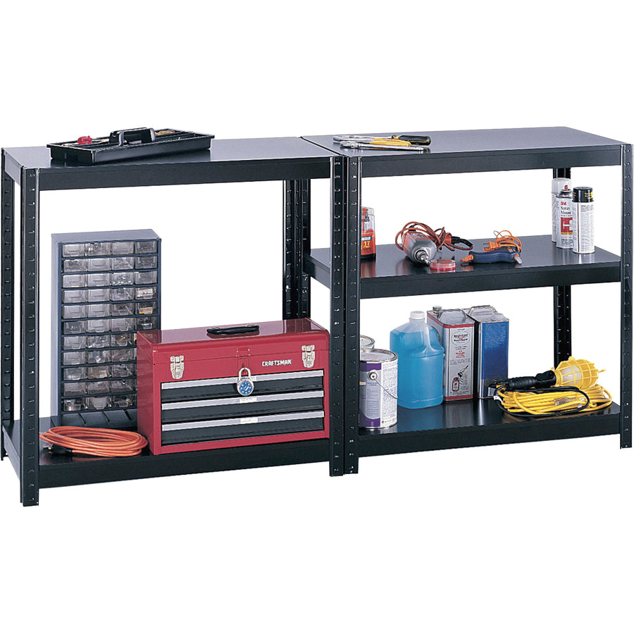 Boltless steel shelving unit features a flexible design that allows multiple configurations as a five-shelf 72" high storage unit or 36" high workbench. Unique construction requires no nuts or bolts and assembles in minutes without tools. Each shelf adjusts in 1" increments and holds up to 850 lb. evenly distributed. Steel shelving has a durable, black powder-coat finish for durability.